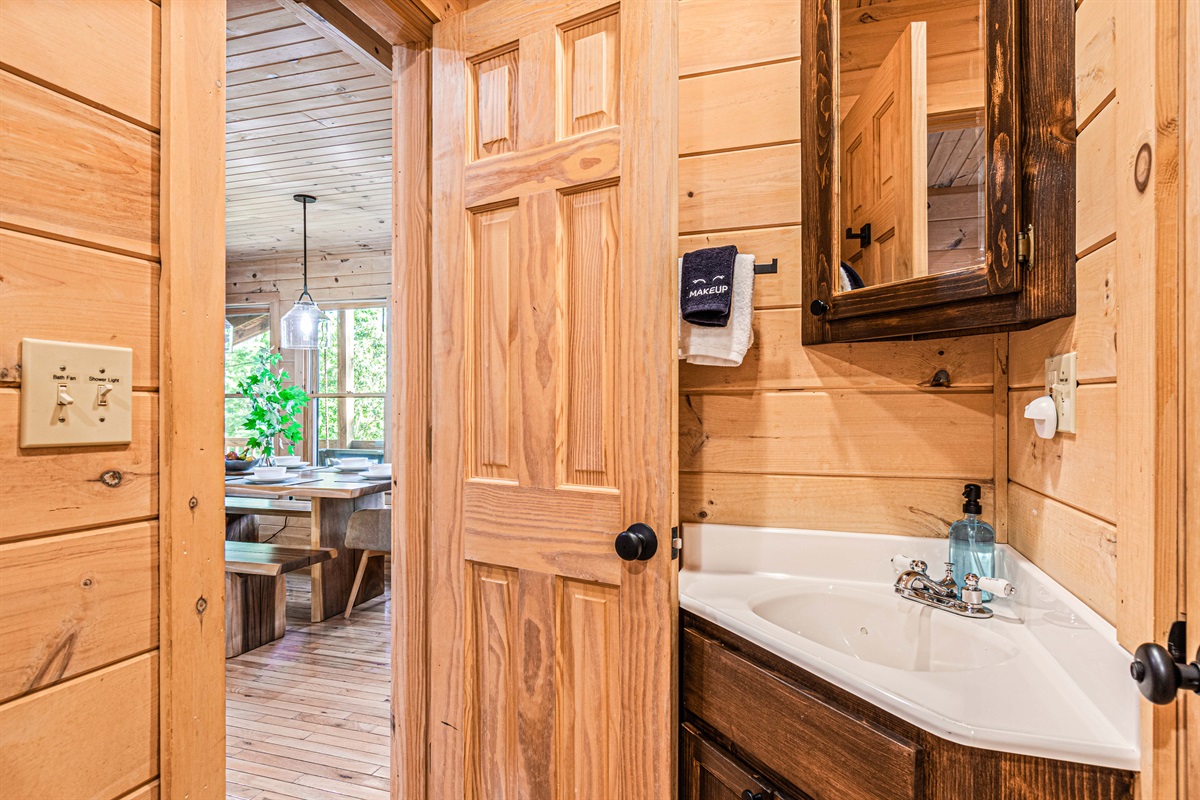 There are two bedrooms upstairs with amazing views of the Blue Ridge Mountains. The bedrooms both have ensuite baths, king-size beds, dedicated workstations, and a TV in each room. There is a shared porch with two rocking chairs, with an even better view of the Blue Ridge Mountains and Chattahoochee National Forest.