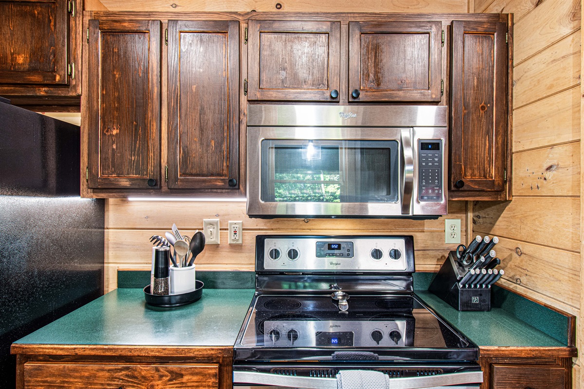 The idyllic outdoor space is perfect for multiple families or groups of friends. The cabin boasts three porches, two of which offer stunning views of the Blue Ridge Mountains and Chattahoochee National Forest. You can cozy up on the porch swing/bed with a good book or your favorite adult beverage (we recommend both) and feel the stress of life drift away. On the expansive back porch, enjoy a relaxing game of corn hole while preparing dinner on the Blackstone griddle or making your own pizzas. As the day winds down and gives way to night, gather around the Breeo smokeless fire pit and marvel at the stunning night sky while marshmallows roast over the flames. If you are still hungry, you can sear a steak on the rim of the fire pit or cook an entire meal using the attached grill screen. Enjoy this primal experience loved by world-class chefs and s'mores lovers alike.